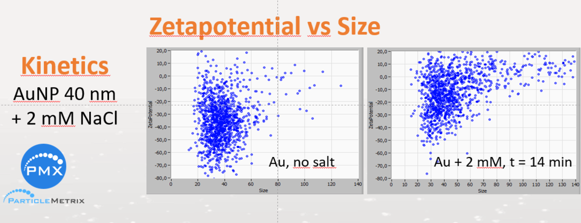 The following example shows the kinetics of zeta potential and size after adding 2 mM NaCl solution to a dispersion of 40 nm gold particles.