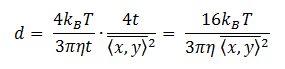 In NTA, the particle fluctuation of a single particle is registered in two dimensions. After combining the Stokes-Einstein relationship and the two dimensional mean square displacement, the equation can be solved for the particle diameter d with: